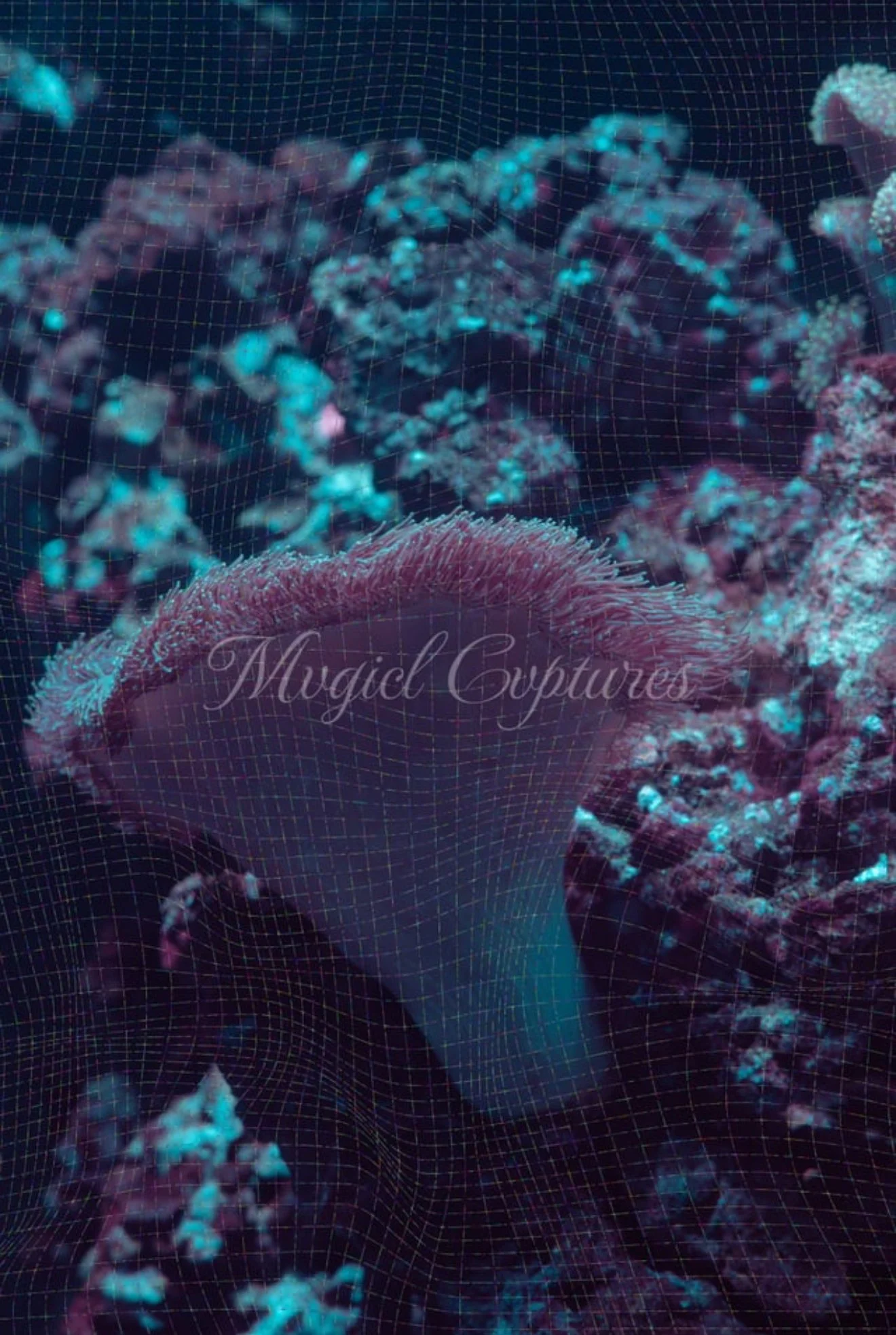 A jellyfish drifts through a warped, dream-like current—its delicate tendrils dissolving into shadow and light. The distortion grid wraps around it like an underwater aura, turning its movement into something otherworldly and celestial.